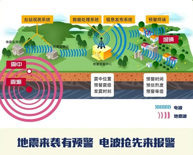 地震预警,是地震发生后,利用电波比地震波快的原理,在破坏性地震波到达前,向目标区域秒级发出警报。